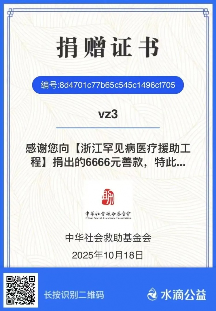 中华社会救助基金会的【浙江罕见病医疗援助工程】,长期致力于为罕见病患者提供医疗费用支持,缓解其家庭的经济压力,这也是黄威选择该项目的重要原因。他坦言,伤病期间更能体会到病痛带来的困境,希望自己的微薄之力能为罕见病患者撑起一片蓝天。